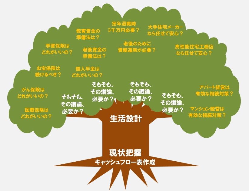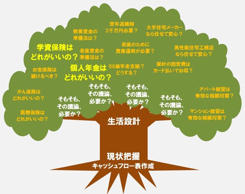 『生活設計の木』 を、贈ります。自分の頭で考える生活設計。 ※この絵、まだ作成途上・・です。やみくもに貯蓄することも、やみくもに節約することも、(各業界に洗脳されながら・・)枝葉(えだは)の作業をしているに過ぎません。枝葉の作業をしている限り、永遠に、不安が払拭されることはありません。(将来が見えないから当たり前)根幹(こんかん)の部分の作業をすることで、(キャッシュフロー表を作成し、 自分たちの現状把握をすることで)その日から人生の見通しが確認でき、根拠を持って考えることができ、確信を持って判断できるようになります。つまり、長年の「不安」が消えることになります。真剣に、キャッシュフロー表を作ろう。顧問会員の記事にキャッシュフロー表を掲載しているので、マネをして作ってみよう。顧問会員にならなくてもいいから、(1家族引き受けるごとに赤字だし・・)自分たちでキャッシュフロー表を作ってみよう。良い未来でも、悪い未来でも、未来が見えれば、確信を持ってお金を使ったり、お金を貯めたり、することができます。いつまでも、業界に振り回されて、枝葉の部分で悩んでいてはいけない。生活設計の木・・かあ?・・っと。〇 商品販売をしない。 〇 しがらみを持たない。誇りをもって、愚直に、 消費者側に立ち続けて17年目の ファイナンシャル・プランナー事務所。《 質問希望? 》 ブログ右「キーワード検索」をどうぞ。 「キーワード検索」に言葉 ⇒ 「このブログ内」 ⇒ 「検索」。《 顧問会員希望? 》 「顧問会員って何?」で支援内容や当事務所との関係を確認の上、右記へfpst@axel.ocn.ne.jpメール顧問会員は、指定した月日のみに受付けます。