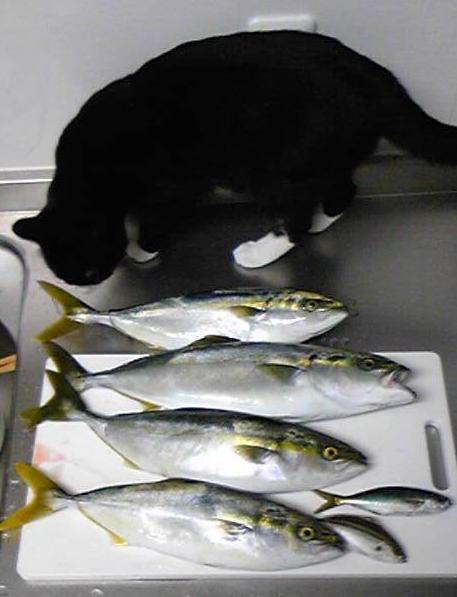 前回日記の五年振りのタチウオを釣った一週間前に・・・タチウオを釣りにマリーナシティに行ったらボウズを食らった当たりは五回ほどあったが全部空振り(情けない)夜中からの通し釣りだったので夜が明けたら帰ろうと思っていた。ふとマリーナには今、青物が回遊してることを思い出した!しかし・・・安い磯竿でタチウオ釣りをしていて仕掛けも準備していないおまけに今まで色んな所で回遊があると聞いた所で小魚を泳がせてみたが一度もヒットした事が無かったのだ。つまり良い思い出が無いやりましたよー。駄目元で、三号ハリスにチヌ針結んで棚は1.5ヒロ・・サビキでウリ坊を釣り、背がけにしてチョイ投げ。んー近いけどいいか。サビキでアジを狙いながら、(ウリ坊ばっかやんけー)とぼやきながらウキを見るとウキが無い マジで?DAIGOばりに思わず声を出してしまう半信半疑で糸を送り込み大合わせ→ガツーンとフッキング!!ん?意外と走らないな・・青物ではないのかも・・と、思った瞬間足元で急に走る!ドラグが鳴る!おお!安物の磯竿が満月に・・結構、引きよるなー。おいおいタモあれへんがな、抜きあげるしかないがなー。竿折れそうやがな~。・・と独り言!おかしなオヤジやでこれ。寄って来た魚影を確認すると間違いなく青物!よっこらしょと抜きあげにも成功!しかし・・魚がいるとこんなに簡単に釣れてしまうのか?ノマセ釣りというのは初めて堤防から釣った青物に感激!ツバス45センチでしたそこから、おお!マジで?を繰り返し、ぼつぼつとあがりだすもののサイズダウン・・まだまだ釣れそうだったけど食べきれないので(これ大事やで)納竿とした。結局、35センチから45センチのツバスを四本!自分でもびっくりサイズは不満だけどもこれ以上のサイズが来てもこのタックルでは獲れなかっただろうから良かったかも・・・タチウオに振られてツバスを釣る!の巻きでした。 こたみも興味深そうです