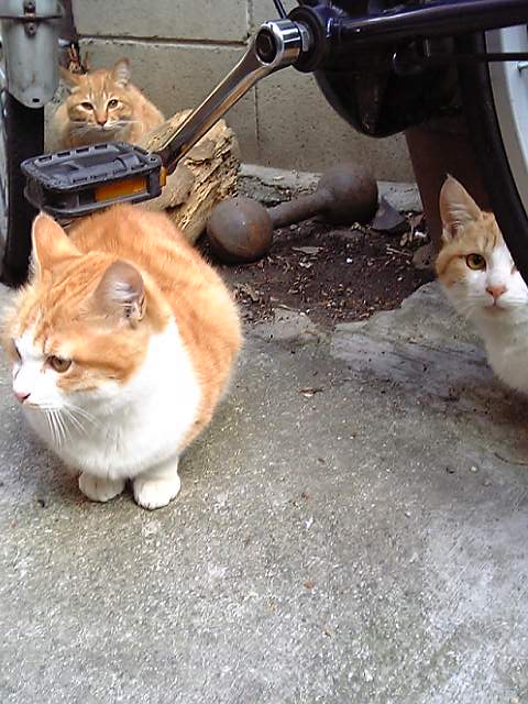 いえいえ・・仲は良いけど後ろの茶色だけ違います。手前の二匹は兄弟。後ろも男の子です。親猫が離れた所で子育てして、連れて来たんですね・・親は子供をお願いしますとばかりにいなくなりました・・猫は、私に色々と大切な事を教えてくれます。母性って凄い!この子達は大人になると女の子を求めて旅に出るのでしょうね自由・・それは野良猫の特権ですからね
