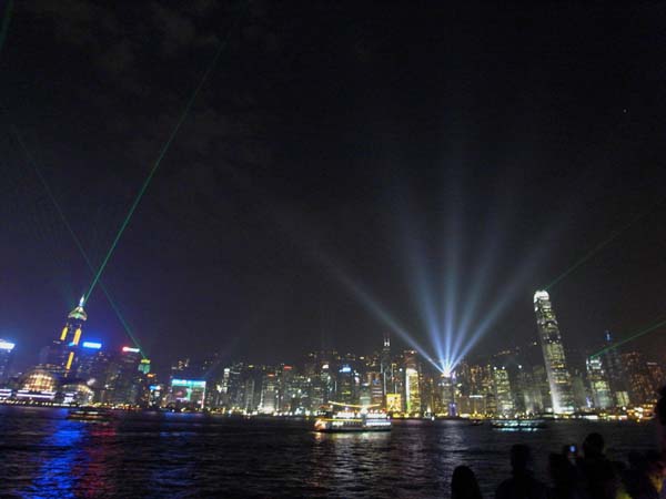 ハナシに聞いていたシンフォニーオブライツを見てきました。ビクトリアハーバーの夜景にプラスして見られるこのショーは、毎晩午後8時から15分位行われています。沿岸のビルの屋上から、音楽に合わせサーチライトやレーザー光線で繰り広げられる音と光のショー ホント素晴らしかったです!7月1、2日は中国返還記念日で、夜景+音と光のショー+花火が見られるそうです。この日は超豪華版、百万ドルの夜景ですね!このシンフォニーオブライツ、毎日行われている事で 永続的な光と音のショー としてギネスに認定されていそうです。 つづく