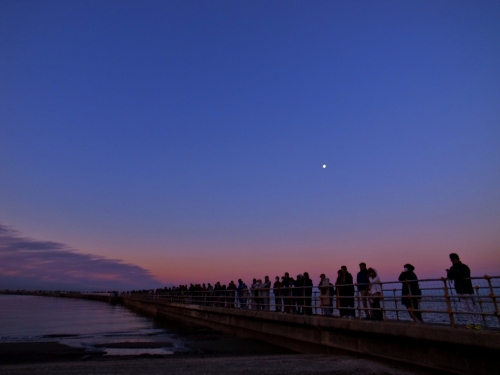 恒例となった初日の出RUN、、、ラン仲間と駅で待ち合わせ、海まで走って初日の出を見てきました。昨年こんなにいたのかなぁ??路駐車両も多く、年々人も増えてます。。。釣りの桟橋、先端まで人でいっぱいでした。晴れの天気予報でしたが、微妙なところに雲がかかり(〃 ̄ω ̄〃ゞ元旦の朝、地元の初日の出はこんな感じ d( ̄  ̄)冷たい空気に気合を入れられ、1年の始まり清々しい気持ちになります。日の出を確認?? パトカーが忙しく走り回り、路駐車に警告のメッセージを流し、、、人で溢れた桟橋、あっという間に人が去り、車も去り、、、いつもの風景に戻る。。。今年もラン仲間と走って2013年がスタートしました(* ̄(エ) ̄)/