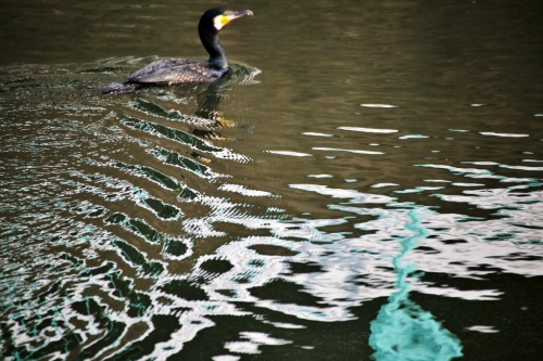 微風、鏡のような水面、、、写り込んだ景色、、、鵜が立てる波紋に色が混じり合いアートな世界に。。。フェンスの色が混じり合い、、、鵜が進むと、、、反射した光が揺らっと。。。鵜が去り、、、移り変わる写り込みの世界。。。 鵜を追いかけて、、、アートな水面見つけましたo(^▽^)o
