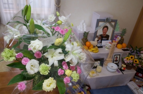 今日は息子の月命日、、、朝、9時が近づき涙声になる家内、その時心臓が止まる音が聞こえたって!重症肺炎、痰を引いてもらった時の音、、、心臓が止まった時の音。。。私は!と言うと、、、病院、3時間ほどしか居られないと聞いていたので、、、その時を待っていたかのよう、、、葬儀社に連絡、車の手配!病室では頑張れと声をかけ、、、病室の外、その後の手配!親の役目、、、本当に辛い。。。あの日を思い、目頭熱く、、、胸熱く、、、辛い朝。。。そんな気持ちを察したよう?ダイバー仲間、、、友人たちからフラワーアレンジメントが届きました。息子、花に囲まれきっと喜んでいる事でしょう!友人たちに感謝!私と家内、、、涙の上書き。。。