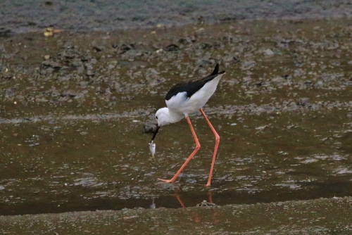 背が高い シギ だから セイタカシギ、、、って見たまんま!学名は「皮ひものような脚の鳥」を意味してつけられたとか、、、脚、確かに皮ひもみたいです。孫に鳥の絵せがまれるのですが、、、絵が下手なワタシでもこの鳥なら書けそうです;^ω^)エサのお魚、、、お口に合わないのか?ポイしてました。食べ物には うるさい やつなのかも??