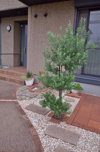 オリーブの木、、、茂った葉、下から3っ目右側、蝉わかりますか?脱皮してました。お盆を前に、、、色々なこと思ってしまいます。