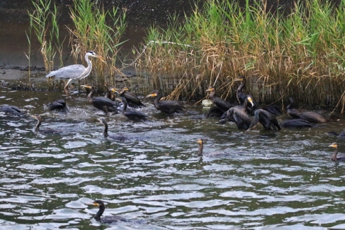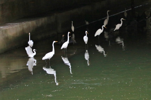 今朝の水路、、、サギ集団、、、集団サギ。。。何が原因?もめるのはこの鳥の習性??サギ行為(^^ゞ