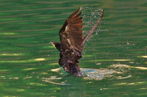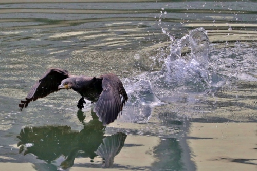 穏やかな水面から水鳥が飛びたつ風景。。。、、、ですが!あわてた様子、、、?今朝は青潮、悪化した環境から逃げているようにも見えます(゚Д゚;