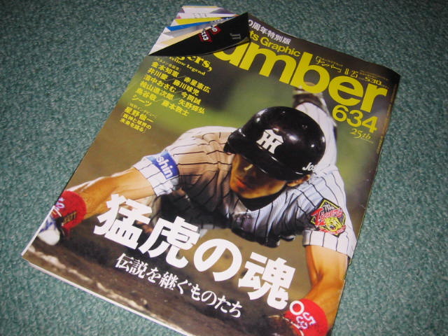 1月も半分過ぎましたね。成人の日もとっくに終わって・・・・。 明けましておめでとうございます!!忘れてましたぁ! 去年の暮れ。大掃除の最中、整理した雑誌の中からイカス表紙にふと目が止まったNumber 634号、『猛虎の魂』。 ありがちなパターンですけど、掃除のことはほったらかして、小一時間、見入ってました。 この号が出た頃はちょうど『死のロード』の真っ只中・・・・だったかな。死のロードを何とか勝ち越した後も9月29日の優勝まで色々ありましたねー。 読み返しながら思い出して、一人しみじみしてしまいました。 それにしてもいいチームになりましたよねー、タイガース。なんつったって3年の内に2回もペナントレース、征しちゃうんですもんね。 3年に2回ですよ!3年に2回も!!なんぼでも言います。ちょっと前まで、セ・リーグの底辺をさまよってたのがちょっと信じられないくらい。 これからのことを考えても、去年、ファームも優勝したことに象徴されるように有望な若手も少なくないですしね。 もう2週間ほどで早くもキャンプインですけど、さあ、今年はどうなりますでしょうか。そう簡単じゃないけど、セ・リーグでは久々の連覇、さらにその先の日本一・・・・。うーん、どうなるかなー。 今年の個人的な抱負としては、「甲子園に行く!つーか、行きたい!でも、まー、手近なマスカットスタジアムでもいいかな・・・・。とにかくナマで見たい!」。
