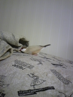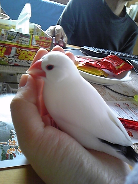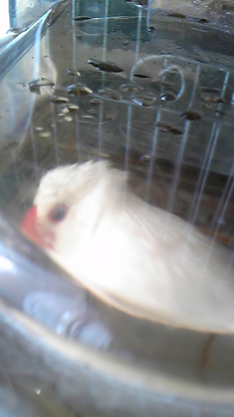 ぐ尾だけが黒い白文鳥。家の中は暑いね~~エコで扇風機。