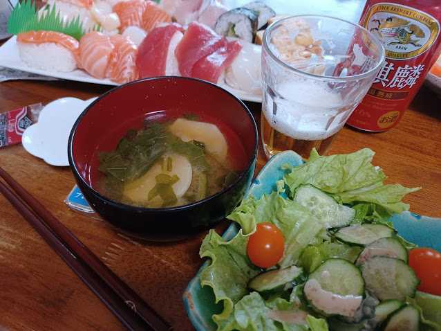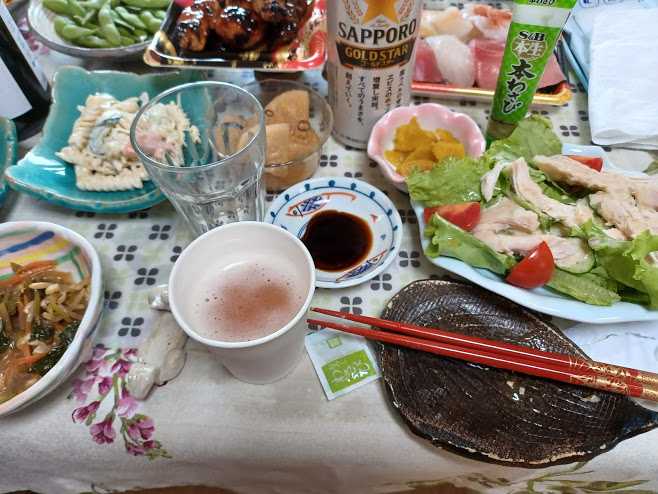 毎月行っている女子会!心配でお寿司屋さんに電話を入れたら・・”今月いっぱいお休みしています”と返事!それで・・我が家でやることにした。握り寿司を”はま寿司”で予約!取りに行って頂きました。特上寿司でしたが・・やはりね・・仕方ないです~おつまみを作ったが・・おもたせも多く!ありがとうございます!デザートにメロンを出して・・そういえば水ようかん写ってませんね。私が作ったものです。長時間・・ ありがとうございました!