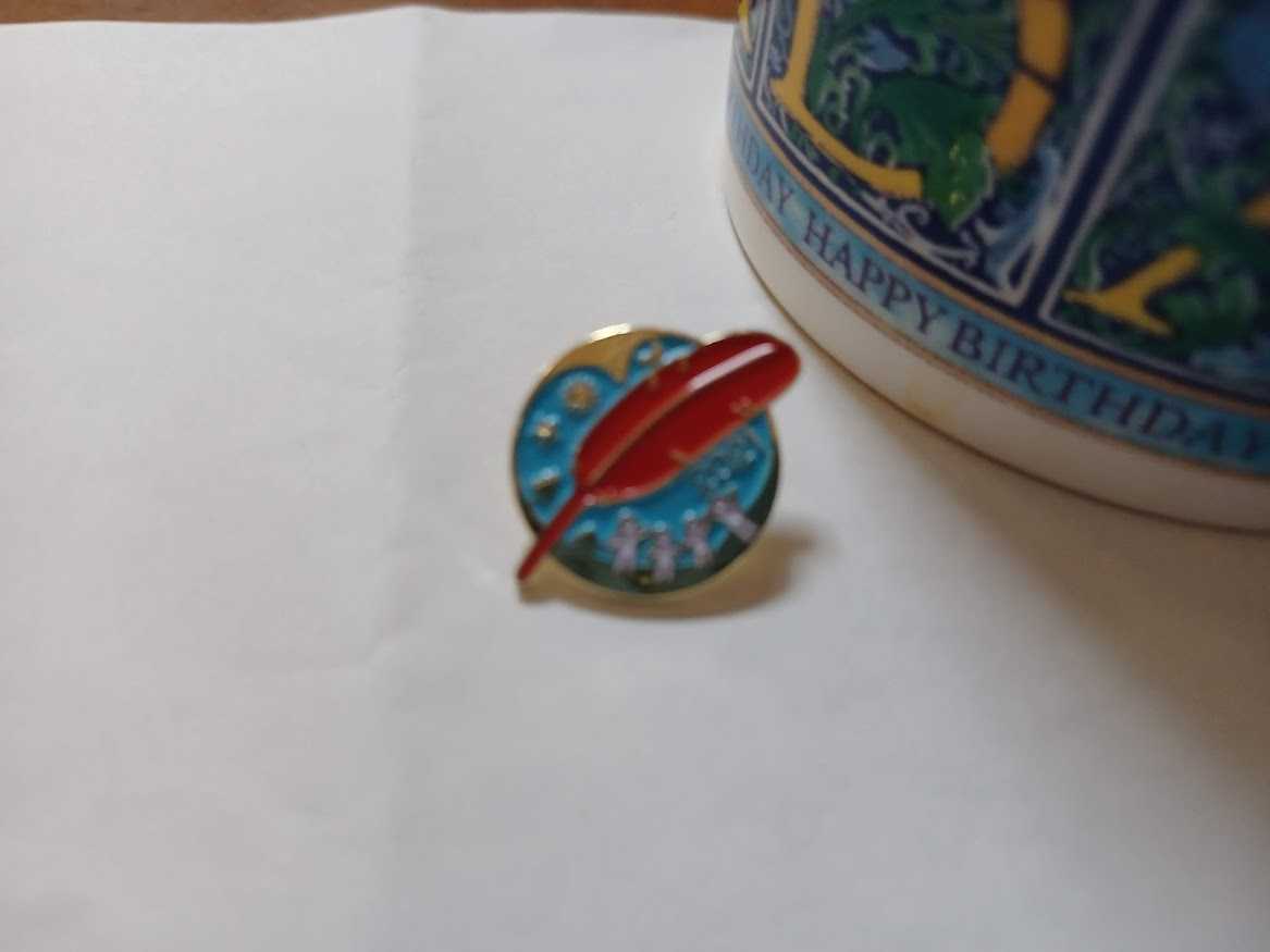 今売っているのは赤い羽です。私も持っている。何枚か入っているものですが・・一回つけるともう次に貼れない。だから5枚も入っている?これはある会で・・羽根一緒に頂きました。これは何度もピンでつけられるので・・ ラッキー