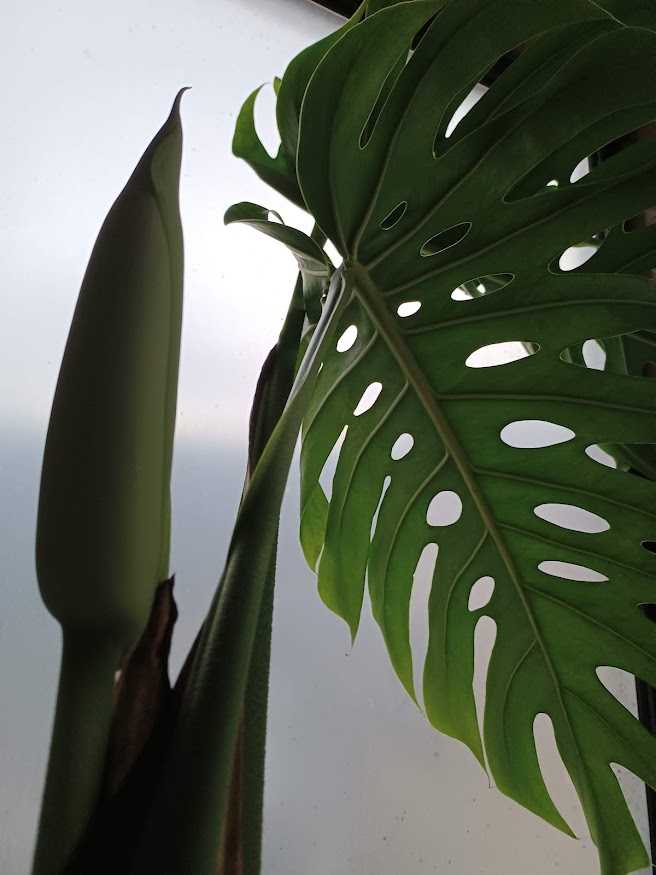 我が家のモンステラです・・いつもの葉が出るかなと?細長く棒状に出る葉!そのうち開くかな?違ってますね。触ると固い~花?実かな?どちらにしてももうしばらく! 待ちます