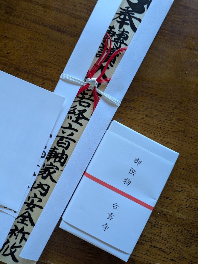 先日お寺さんで・・般若心経の会がありましたが・・鐘を突くお仲間さんが所要があり、二人とも欠席。お寺さんからお札を頂きました。 ありがとうございます!