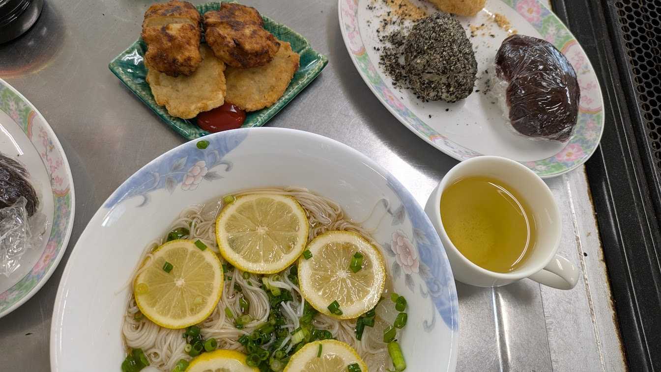 つい一回の小呂売りをやりました。今回はそうめんにレモンを載せて頂きました。後はチキンナゲットを・・それと牡丹餅を三種類もね。皆さん頑張てましたよ! 美味しく頂きました!