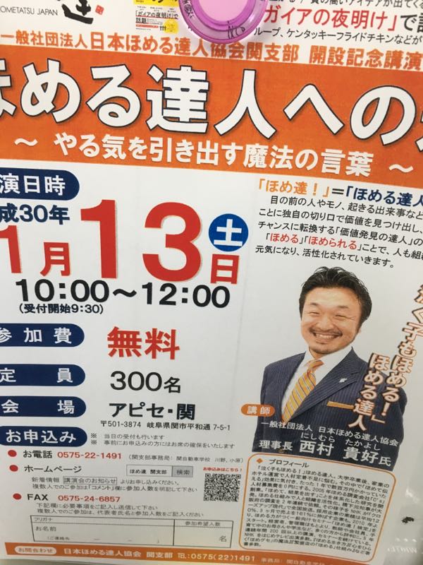 岐阜県関市に誉めの達人の西村貴好さんて方が講演にきました。無料セミナーでしたので期待せずにいきましたが、見事な裏切り。とにかく自分の半径3メートル以内の人を褒めちぎって下さいという。 褒める行為は回りもプラス、自分もプラス。手間もかからず元手もいらずです。 わたくしもこれから周りを誉めまくろう。