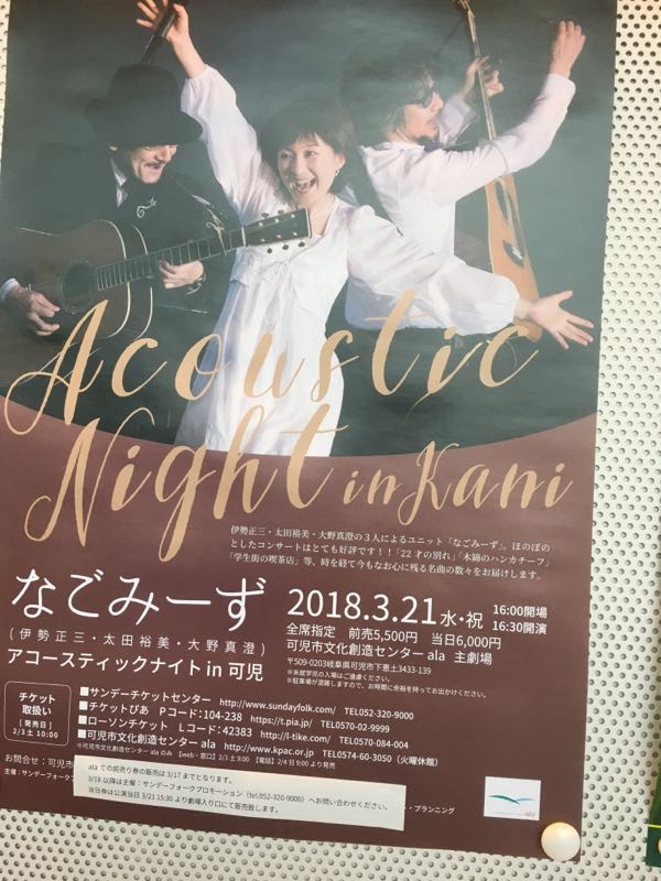 オヤジの青春時代はフォークソングが全盛期でした。神様岡林信康を始め、 吉田拓郎、かぐや姫、チューリップなどが名を馳せてました。 かぐや姫のメンバーの1人伊勢正三さんが今夜、 元ガロの大野真澄さん、太田裕美さんと一緒に岐阜県可児市までコンサートにきてくれました。 大野真澄さんは、学生街の喫茶店、太田裕美さんは木綿のハンカチーフ、しょうやんは、22才の別れなどを歌い、1000人はいたと思われる会場を盛り上げてくれました。 最後のしょうやんの【ささやかなこの人生】は全員総立ちで熱唱。わたくしもカラオケ以来の熱唱。 しょうやん、66才、大野真澄さん69才。 まだまだ現役でファンを楽しませてくれます。 還暦近いわたくしですが、彼らにパワーをもらいました。