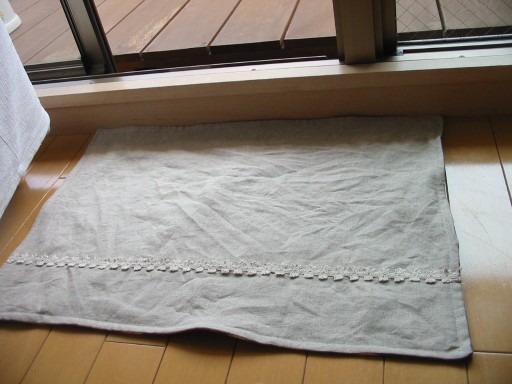最初はキッチンクロスを作ろうと思って裁断したのですがベランダに出るときにひくマットがほしいなと思っていたのとちょうど良い大きさだったので先にこっちをつくることにしました。リネンはこちらをつかいました。綿麻トーションレースをつけただけのシンプルなマットです。裏はバスタオルなんですが、もう1、2枚バスタオルかさねたほうがよかったかな~