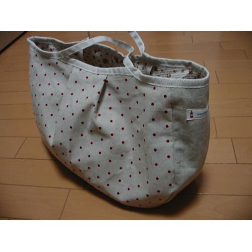 コットンタイムに載っていたグラニーバッグです。奈緒ママさんの作品がとってもかわいくて、同じ本を持っていたので早速つくってみました。接着キルト芯のかわりにハンドクラフト用接着芯をつかいました。タックの場所や生地が重なって厚くなっているところで針が折れてしまったので厚地用のはりに替えるとすいすい縫えました。以前ミシンを直してもらったとき針を折るのはミシンに負担がかかって一番だめなことといわれたのを思い出しました。ちゃんと縫うものによって針も変えないといけないんですね。生地は綿麻キャンパス赤水玉です。55X50cm1枚でつかいました。裏はワッフル生地です。マチの部分はリネンです。本ではメートラインを使ってますがかわりに麻混ぺシャムテープLを使ってます。出来上がってレースもなにもつけてない、、。シンプルすぎる、、と思いマリンライフのテープを縫い付けました。