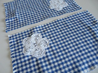 綿麻先染めチェックブルーにバテンレース ミニフラワーを縫いつけた簡単ランチョンマットですちょうどグラスをおく位置にレースを縫いつけました綿麻の生地作る前に、洗濯機であらったらいい感じに糸がほどけていたのでそのまま使うことにして上と下の部分は三つ折りしましたブルーとホワイトで少し涼しげです こちらも簡単コースターレトロアニマルパネルの生地をパネルごとにカットして裏は細かいワッフルの生地にしました子供がよろこんで使ってくれそう☆ そして先月ですが娘のお誕生日の日にお花をいただきました☆7歳なのでユリの花が7本こんな素敵な花束もらうことないのでとても喜んでました☆その花瓶の下に敷くものがなかったのであわててつくりましたジェーバチカのパネルを二つカットして中表に合わせ レースをはさみ 裏返してます 人気ブログランキングへ