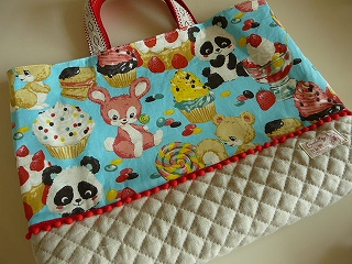 新着生地の ぬいぐるみスイーツの生地でレッスンバッグをつくりましたこの生地4色入荷してます底の部分をキルティングにしましたアイビーテープにレースを縫いつけた持ち手にしたりぼんぼんテープでかわいい感じにしましたどっちの色のバッグもかわいい♪ 人気ブログランキングへ