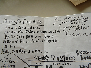 2日ぐらい前に ポストにはいっていたハンドメイドのガレージショップのチラシ先ほど行ってきました3人のママさんたちのお店年に数回されているそう。お近くにもこんな感じで 活動してらっしゃる方がいて親近感がわきました♪かわいい革のストラップ購入してきました♪ 人気ブログランキングへ