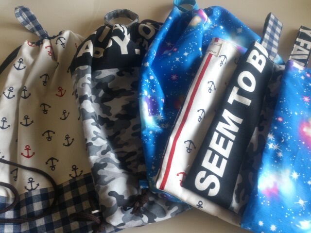 体操服を入れて背負える巾着と上靴入れ作りました全部で8セットできた!商品を委託している徳島の写真屋さんから の注文ですオックスと 綿麻の生地を使っているので接着芯は使ってないですが しっかりめに仕上がってます人気ブログランキングへ