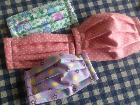 立体マスクをつくりましたひだりが 子供の小さいサイズみぎは中サイズいろいろ作って 娘に聞いてたところはなのとこにワイヤーがあったほうがいいのとこの形がいいかな~と、、おもてが綿で裏がガーゼなので洗濯にも丈夫です