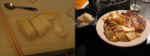 写真は 白菜 です。今日は豚肉のステーキみたいなものにしました。まぁまぁな肉でこれで1.2ユーロ。はコストパフォーマンスいい方だなぁ。
