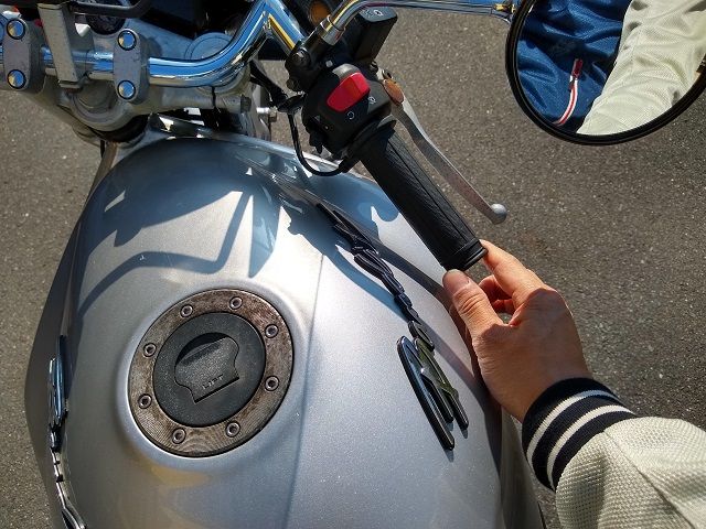 バイク屋さんには「ハンドルストッパーを修復して、左右の切れ角を揃えましょうか?」と提案されましたが、とりあえずタンクに当たっていないので、これで良しとしてバイクを引き上げてきました。