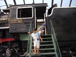 今日は朝9時過ぎ頃から近くの運動公園へ行ってきました最近暑いので昼間公園で遊ぶのはとても無理だから・・・でも朝からもう日差しが強くて暑かったです今日はパパが休日出勤なので私一人で3人連れて行きましたまずは機関車に乗って遊んでた二人すると友達のKちゃんも息子を連れて来てたので一緒に遊ぶ事にでもそれぞれ好きな遊具で遊んでます^^;ひろはいつのまにかこんな高いところに登ってましたしょうはこれに乗ったあと消防車の方へ・・・Kちゃんの息子はジャングルジム?の迷路や滑り台しばらく遊んでたらお昼近くになりさえも眠くなったようで機嫌が悪くなったので家に帰りましたしょうはまだまだ遊び足りないようで帰るのに苦労しましたが家でプールをしようでようやく帰りましたさて家に帰ってご飯食べたあと約束通りプール気持ちよさそうでしょ?さえもちょっと足や手を水につけてやりましたその後は部屋からお兄ちゃんたちの様子を見てます^^あんまり羨ましそうに見てたので友達の子のお下がりの水着を着せて(まだブカブカでした)プールに入れてみましたでも硬直状態^^;ちょっと早かったかな?