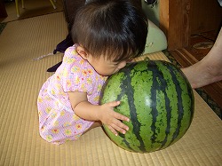 今日は私の実家に行って来ました途中父の大好きなお饅頭を買っていって実家に着いたのはお昼頃父は従兄弟の法事に行っていて母が一人で待ってました今日行くって事は昨夜電話してたけど時間は言ってなかったので母はいつ来るのかずっと待ってたみたい着いた途端「遅かったね~」って・・・だってね~出かけるのにいろいろと手間取っちゃうのよ~仏壇のところに行くと大きなスイカが置いてありました父が作ったスイカです今年初めてできたスイカらしいそれを見たひろとしょうは食べたくて食べたくてウズウズひろがかかえて居間に持ってきたら、さえの目がキラリーン♪ズリズリとスイカのところへ高速移動(笑)そしてスイカにチュッ!食べ物ってわかってるのかな~この後切ってみんなで食べましたまあまあおいしかったです♪半分は貰って帰りましたこれから時々貰いに行かなくちゃ!父が作ったスイカはなかなかおいしいので楽しみ♪