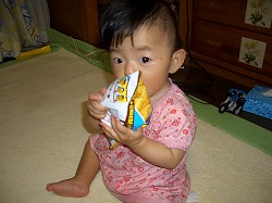 気付いたらさえは座ったままでの移動が早くなってきてます^^;やっぱり普通のハイハイはしないのかな~手を前について器用におしりで移動してるのです最近は部屋の隅から隅までも行けるようになって電源プラグを持っていたりなかなか油断できません今日はストローの練習をしてみました今までミルク以外の飲み物と言えばお茶しかやったことがなかったのですがお兄ちゃんたちの飲むジュースを欲しがるようになってきたので赤ちゃん用のジュースを買ってきたのですそしてストロータイプのマグも♪やっぱりストローで飲めたら外でも楽よね~って思ってでもいきなりは難しいみたいです最初はただストローをくわえるだけでしたでもちょっとだけ吸ったんですよ~すぐに飲まなくなったけど・・・これからぼちぼち練習させてみようと思います積み木で遊んでる3人です↓さえもしっかり仲間に入って遊んでます