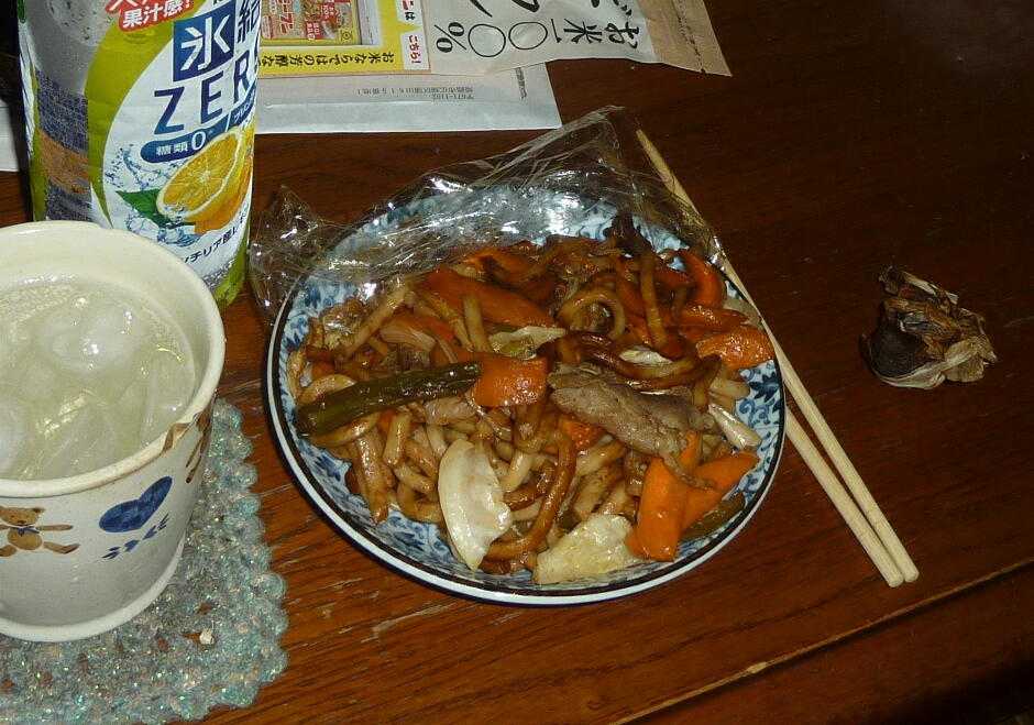 夕食の残りの焼きうどん