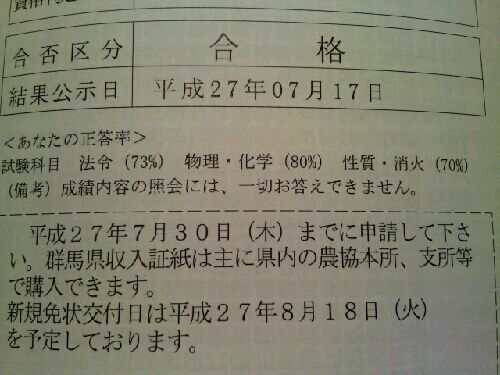 本日、僕が受験した危険物取扱者試験の合格発表の日です。 テレビで、東大の、入試なんかで 合格者の番号一覧見ながら 全く関係ないこっちまで、ちょっとドキドキしながら画面を見つめちゃうことありますけど、 よろしければ、どうぞ。 東大とは雲と地。 あるいはそれ以上違う試験ですが。 消防試験研究センター ↓ 合格発表 ↓ 危険物取扱者 ↓ 群馬県 ↓ 乙種4類 受験番号は E1-0023