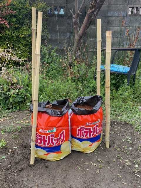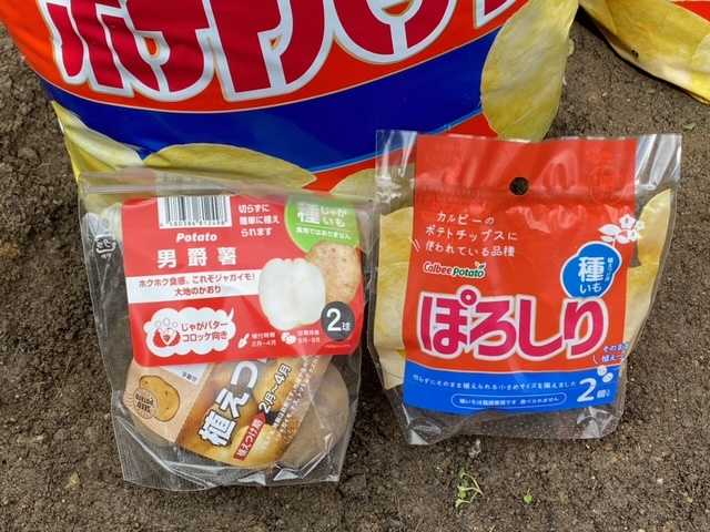 そのパッケージに植えたのは、この二種類。「ぽろしり」はカルビーのポテトチップスと同じイモができるようです。また、もう一つはベタですが男爵イモ。メークインは、畑に植えているので違うものにしてみました。