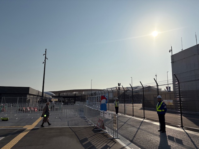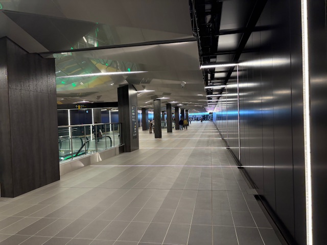 1面2線のホームを上がったところです。ここは開放感があってとても広いのですが、ホームは大勢来場する(といわれている)客がかなり滞留するだろうなという仕組み。一般的な地下鉄のホームの構造になっていました。