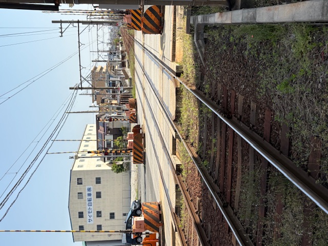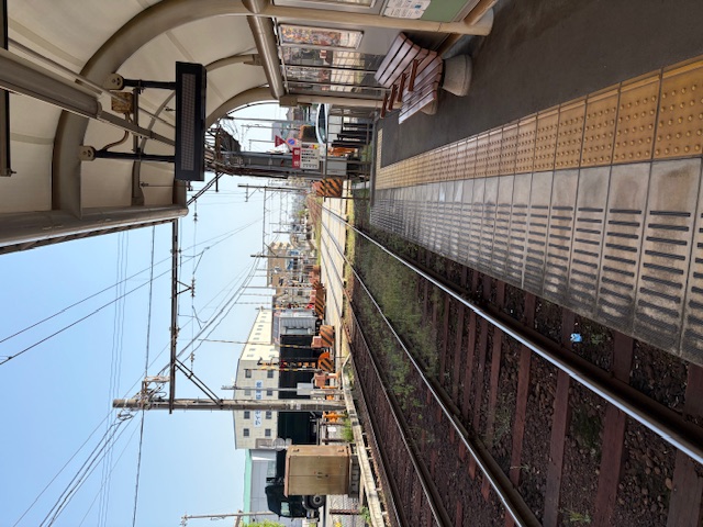実は、上りのホームはこの踏切の向こうにあります。こういうパターンは路面電車ではあるあるかもしれませんが、珍しい部類かも。