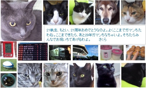 おやじちゃん、おふくろちゃん、21執念、もとい、21周年おめでとうでやんす。ちゃくちゃんからメッセージカードが届いたでやんす。あっしらからも、おめでとうでやんす。あと29年でキンコン式でやんす。あっしらなんとかふんばって長生きして、みんなそろってキンコン式したいでやんす。