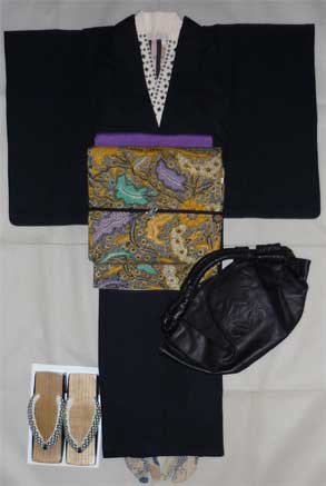 これは、10月17日のコーディネート(げ、2週間も前のことだよ)。友人の会社創立1周年のお祝い会に着て行ったもの。黒の綿シルクの無地に、オールドバティックの綿の更紗帯。紫の帯揚げに、黒の三分紐、トカゲの帯留めをあわせて。足もとは、柄足袋にいつもの下駄。