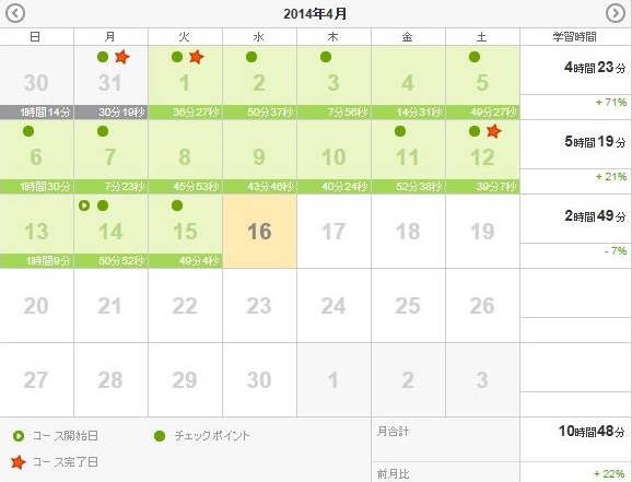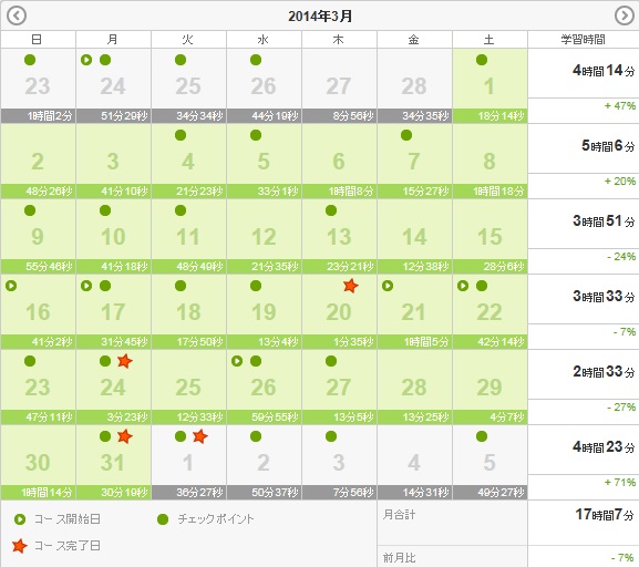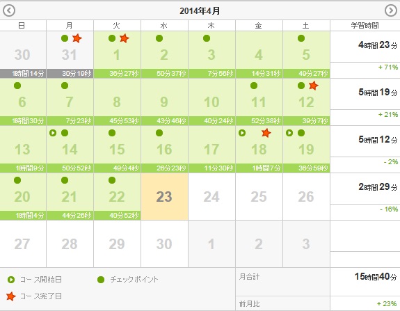 人気blogランキングへ先日、試験を受けたので、これでまたまた一区切り。来月までまた勉強中!昨日一昨日と、早く帰れている。自分の時間がよく取れ、体調も良い。このままのリズム・ペースを維持しよう!!4月7日(月):ラジオ15分・聞き流し80分4月8日(火):ラジオ75分・聞き流し80分4月9日(水):ラジオ45分・聞き流し80分・留学40分4月10日(木):ラジオ75分・聞き流し80分4月11日(金):ラジオ60分・聞き流し80分4月12日(土):ラジオ75分・聞き流し80分・試験用60分・留学40分4月13日(日):ラジオ45分・聞き流し80分・予習復習30分小計:1120分+Y319分=1439分累計:1439分+3494分=4933分※今までの総計15295分(2013年11月~2月)+5043分(2月~3月)