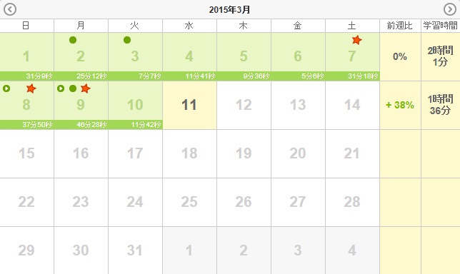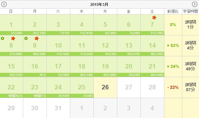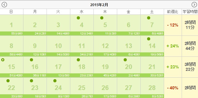 人気blogランキングへ結局、卒業試験はイマイチだった。何より、スピーキング分野が前回より微減、、、、一応、他の3分野は伸びていたので、良かった事にしよう。今週も後半戦、奥さんも忙しくなる。しっかりサポートし、自分自身も元気に過ごそう。2月23日(月):ラジオ120分・聞き流し80分2月24日(火):ラジオ105分・聞き流し80分2月25日(水):ラジオ135分・聞き流し80分2月26日(木):ラジオ120分・聞き流し80分2月27日(金):ラジオ110分・聞き流し80分2月28日(土):聞き流し80分・予習復習60分3月1日(日):ラジオ15分・予習復習60分小計:1205分+Y120分=1325分累計:1325分+1553分=2878分※今までの総計15295分(2013年11月~2月)+5043分(2月~3月)+4933分(3月~4月)+8072分(4月~5月)+7919分(5月~7月)+15240分(7月~9月)+8793分(9月~11月)+20424分(11月~2月)=85719分