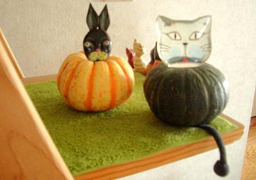 05/10/7 (金)カボチャでホイッ♪なーんてとくにイミもないんですが・・・かわいいでしょ。マメコさんからとどいたカボチャが、変身。ウサギのブローチ(木)と、ネコの置物(アクリル)は二つとも、ヨシコ弾からのプレゼントです。透きとおっているので、向きや光のかげんで、いろんな人相になります。カボチャをどけると、こうなります。・・・