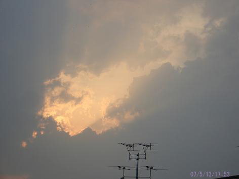今日の夕空きょうはなんとも眠いし、シゴトも日記もお休みやー、と思っているところへ、りんごさんが顔を出した。こんどの作品展はりんごさんのギャラリーで開かれる。出品するトケイなどの、打ち合わせをする。りんごさんは、私のPCで共通の友人、空さんのブログを覗いたりあずきバーを食べたりして、6時ごろ帰った。ベランダに見送りに出たら、夕日が向かいの屋根すれすれにあり、雲の間にピンクの空が輝いていた。
