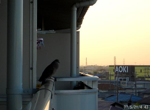 早起きしたので朝空を撮ろうかと南側のベランダへ出たら3メートルも離れていない同じ手すりに、山鳩がとまっていた。カメラを向けたらいきなり”うーうー、うっごっごォ”と鳴きだした。喉の中に雨がたちこめているような声。山鳩は”うーうー、うっごっごォ”を正確に3回くりかえすと、バタバタと力強い羽音をたてて去って行った。・・・・・・・・・・・・・・・・・きょうはかっぽれ稽古日ですがその前に仲良しの従姉妹と会食です♪♪