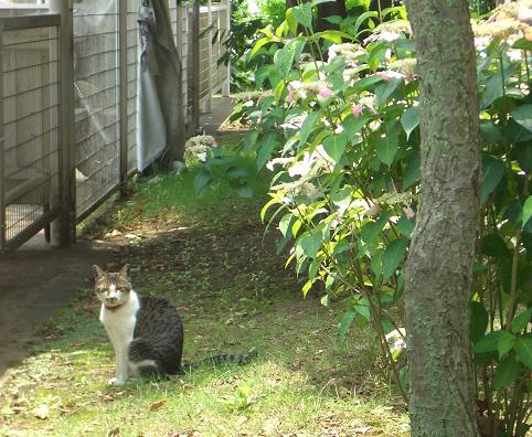 あ、狸!?と、思ったら・・・★近くの住宅地を歩いていたら、ちょっとお屋敷っぽい家の門の向こうにネコ発見!ほかほかと丸く、顔もどこかタヌキっぽい。カメラを向けたら間髪いれず、逃げ出した。ほんの1歩近づいただけで、ビックリ仰天だ。ハハハ、きっと、ここの坊ちゃんだな。それも深窓育ちの、大坊ちゃんね。いつもはお供に囲まれて、ふわふわほわぁ~んとした日々。だからひとりだと、すごく臆病なのね。ビックリさせてワリかったかな。♪狸と猫さんは 似た字の同士~