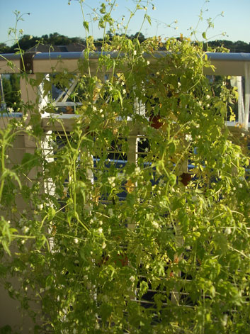 ぐしゃぐしゃカズラ昨夜はすごい風雨だった。ベランダの風船カズラが、今朝はぐしゃぐしゃにまくれ上っている。しかし、花は相変らず満開に、ちからいっぱい咲いている。ぐしゃぐしゃ宇宙の中で、みんなでゲラゲラ笑っている。元気いっぱい、ぐしゃぐしゃしてる。up 風景ちょきん箱★雨粒の銀河★