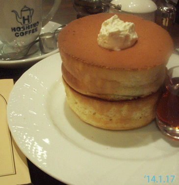 比較用に文庫本置いてみました。ホイッ!ついに食しましたよ。スフレパンケーキ ダブル直径10.5センチの2階建てであります。蟻んこ目線だったら東京ドーム2コ重ねですね。ボリュームたぁっぷり。いやぁ、この看板見てから幾星霜?!?!店はいつも大行列です。遊園地以外の行列はスキでない自分がすんなりこのケーキにありつけるなんて不可能というものですよね。それが昨日11時半頃、何気に・・・というか習慣で立ち寄ってみると1人も待ち人なし♪時間当番のカミサマがよそ見をしたのでしょうか。ツツーッと入店、サンキュー!1時間後、店を出るといつもの行列風景がありました。