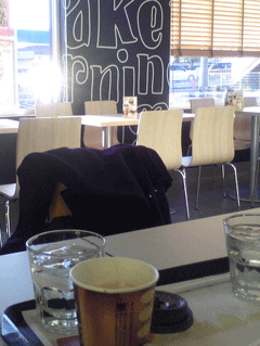 東上線の事故で美容院行が中止、トラちゃんも出かける予定が変更になり、急にポッカリ空いた時間ができた。自由に使える時間切符を手にしたというわけよネ。そうだ、マクドのサービス券があったっけ。ポッカリ切符とサービス券を手に、二人で近くのマクドナルドへ行った。のんびり山を見ながら、のんびりした。後ろにのんびり山が。