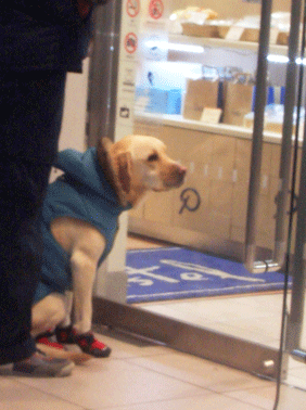 お稽古の帰りに出遭った盲導犬、可愛い靴、はいていた。ケーキ屋さんの前に居るのがキマってて、なんだか嬉しい。