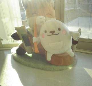 エ~わたくし最近、週一回歯医者さんに通っておりまして・・・待合室の窓辺にこんな方々を発見いたしましてござる。いつもは混んでいて、全然気づきませなんだ。今日は予約11:15分という微妙な時間だったので、待ち人が一人しか居なかったおかげと思われまする。ハミガキマンでごじゃるか?